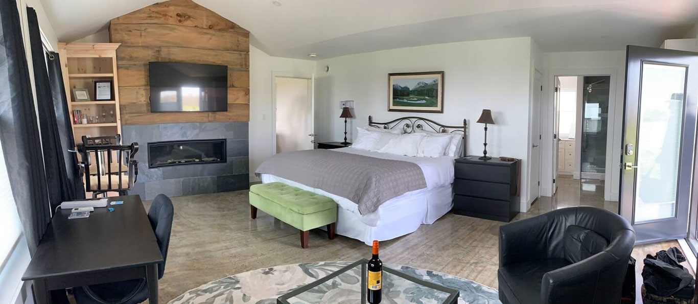 A high-top table can be used for dining or as a small workspace and a coffee table that can also be used for working, along with a comfortable chair.